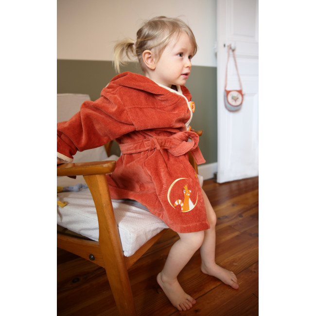 Peignoir à broder avec capuche à pompon, une poche, ceinture sous passant, accroche patère et boutons pour fermeture. Ce peignoir pour les enfants de 2 à 4 ans est en velours éponge, il est extrêmement doux et moelleux.
