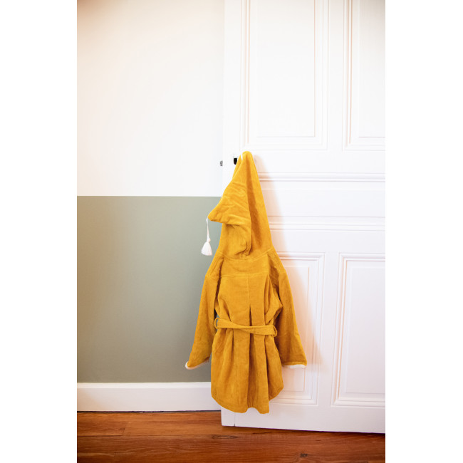 Peignoir à broder avec capuche à pompon, une poche, ceinture sous passant, accroche patère et boutons pour fermeture. Ce peignoir pour les enfants de 2 à 4 ans est en velours éponge, il est extrêmement doux et moelleux.